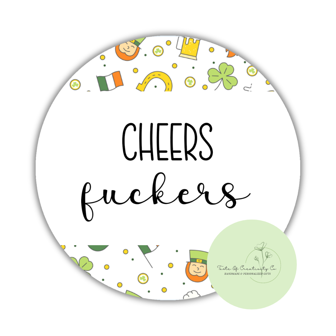 "Cheers Fuckers" Round Coaster, St. Patrick's Day Drinkware, Funny Table Coaster
