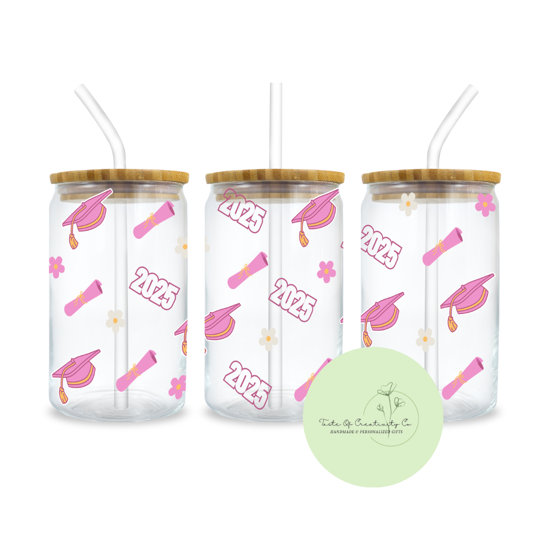 "Girly Graduate 2025" Libbey Iced Coffee Glass w/ Bamboo Lid and Straw, Drinkware Gift, Gift for Her, Gift for Graduate