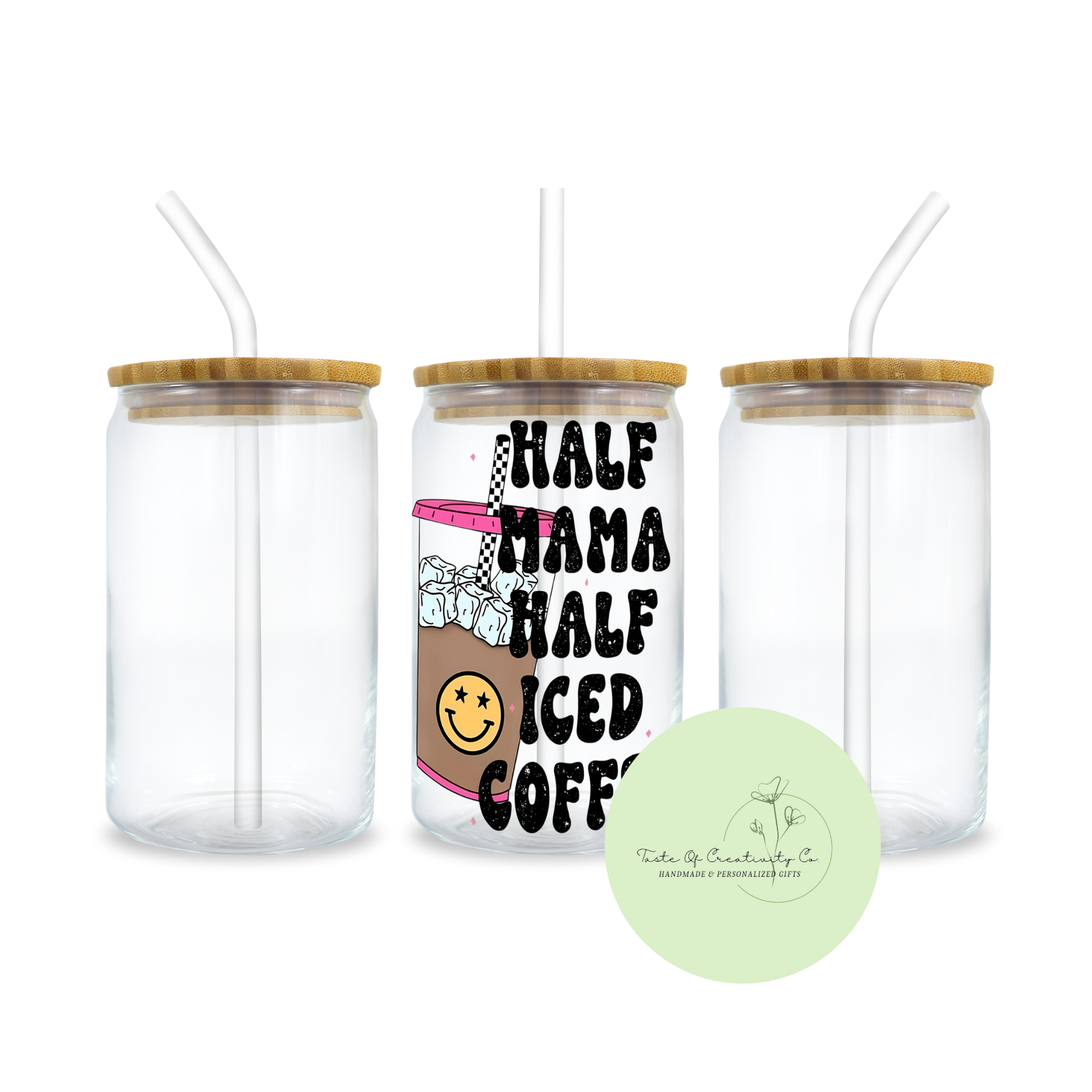 "Half Mama Half Iced Coffee" Libbey Iced Coffee Glass w/ Bamboo Lid and Straw, Drinkware Gift, Gift for Mom, Mother's Day Gift