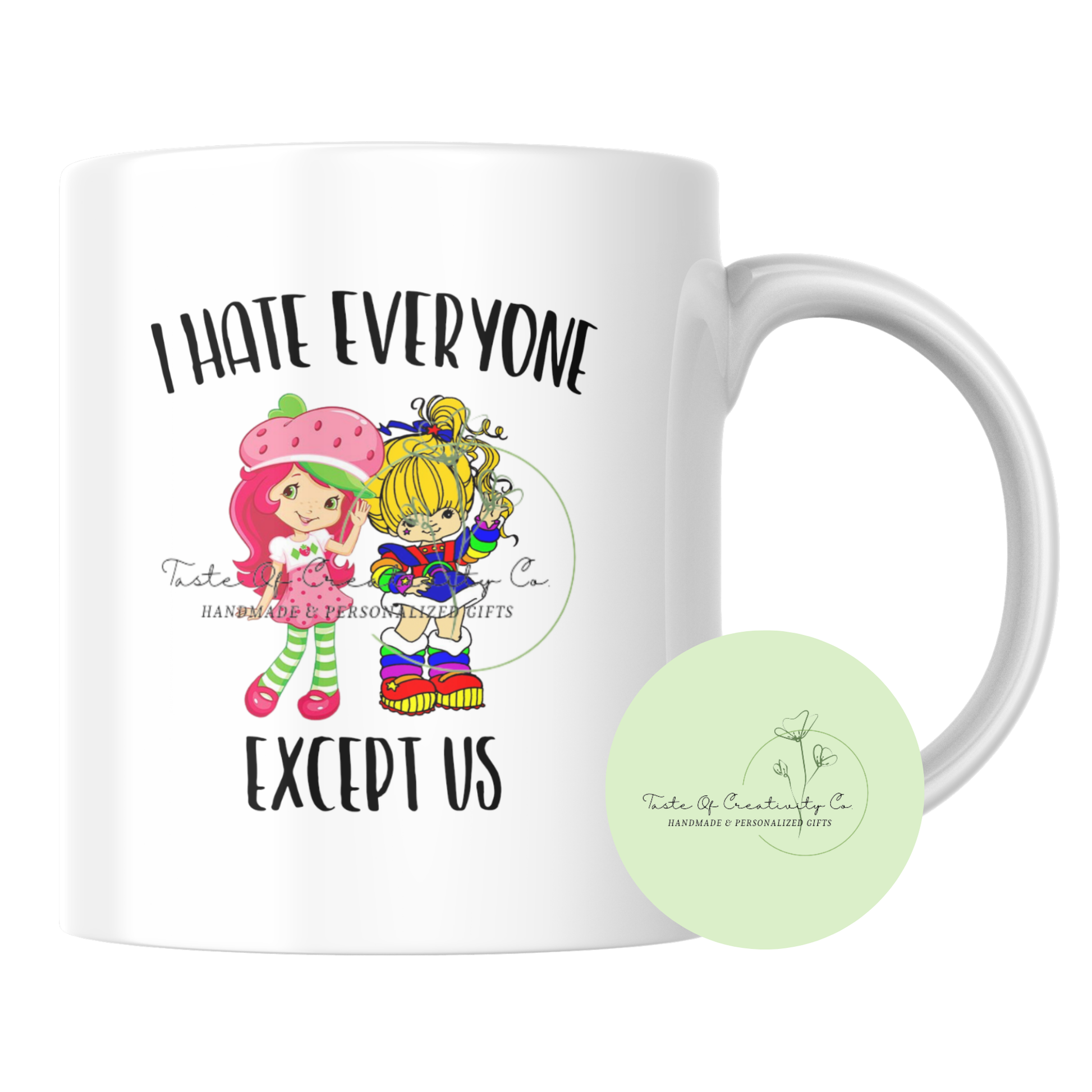 "I Hate Everyone Except Us" Strawberry Shortcake and Rainbow Brite Coffee Mug, Dishwasher Safe, Gift for Best Friend