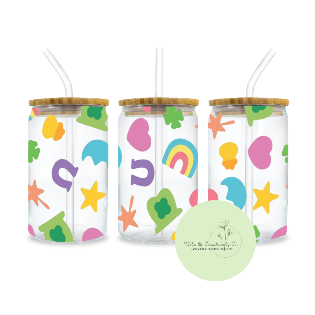 "Lucky Charms Marshmallows" Libbey Iced Coffee Glass w/ Bamboo Lid and Straw, Drinkware Gift, St. Patrick's Day Cup